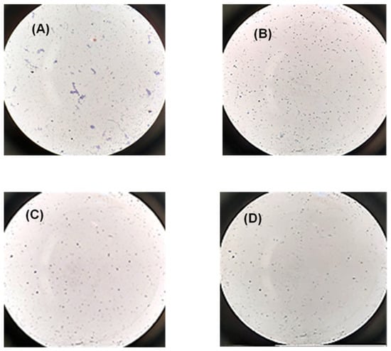 Representative microscopy images of platelet aggregation after staining with Giemsa dye in the following conditions: (A) PRP incubated with CaCl2 for 30 min (positive control); (B) PRP incubated with WFI (negative control); (C) PRP incubated with 50 µg/mL of PRP during 30 min; (D) PRP incubated with 50 µg/mL of PRP for 4 h. Microscope objective: 40×.