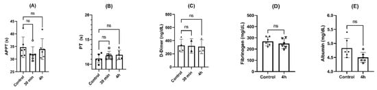 Effects of NPs on coagulation parameters after incubation for 4 h at 37 °C: (A) activated partial thromboplastin time (APTT); (B) prothrombin time; (C) D-dimer levels; (D) fibrinogen; (E) albumin. ns = p > 0.05, ANOVA or paired t test (n = 6).