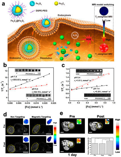 Yu et al. prepared a T1/T2 convertible MRI-guided cancer therapeutic agent based on ROS generated by Fe5C2@Fe3O4 NPs (Figure 1) []. In endogenous tumor environments, Fe5C2@Fe3O4 NPs release ferrous ions due to the low pH, which is disproportionate to the excessive H2O2 at the tumor site, and generate •OH radicals through the Fenton reaction, thus effectively acting against tumors. The high magnetic properties of Fe5C2@Fe3O4 NPs make them capable of T2—weighted MRI. Moreover, the ionization of these NPs in an acidic environment improves the T1 signal. This switchable T2/T1 process visualizes ferrous ion release and ROS generation for cancer therapy. Fe5C2@Fe3O4 NPs have high efficiency and tumor specificity, showing great therapeutic potential in the TME under the guidance of MRI. Further modification of Fe3O4 NPs with photothermal agents or sonosensitizers may provide multimodal cancer treatment with photothermal therapy (PTT) or photodynamic therapy (PDT). For example, altering magnetic Fe3O4 NPs with the classical photothermal agent (AuNPs), in addition to MRI and magnetic targeting functions, can bring additional PTT capabilities and improve the accuracy of Fe3O4 NPs to diagnose and treat tumors. As a result, Fe3O4 NPs have become a novel nanoplatform for personalized tumor theranostics.
