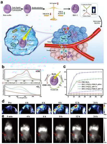 NIR-II PA imaging has been extensively discussed and studied due to its excellent accuracy in diagnosing diseases and the noninvasive antitumor performance of PTT under imaging guidance []. Single PAI cannot effectively provide tumor information with distinct spatial resolution and scale. NIR-II fluorescence imaging stands out in optical imaging because of its good spatial resolution, high sensitivity, and negligible background interference. Accordingly, researchers have constructed dual-modal imaging techniques by integrating NIR-II PA and NIR-II FL imaging technology to supply accurate and successful imaging details and guide precise antitumor treatment. For instance, Zheng and coworkers developed a new nanozyme, HSC-2 (Figure 5) []. HSC-2 has an adjustable dual-modal NIR-II PA/NIR-II FL imaging ability to guide precise, synergistic, catalytic photothermal therapy. In this system, by adjusting the band gap and surface N-doped carbon content to change the carbon–silicon ratio in the frame, the light absorption and emission capabilities in the NIR-II window were optimized simultaneously. Due to its optimum silicon-carbon ratio, HSC-2 produced strong NIR-II PA absorption and excellent NIR-II fluorescence emission performance. As a dual-modal imaging probe, HSC-2 not only detects deep tumor tissues but can also display comprehensive information on tumors with high resolution. The POD-like property of HSC-2 can transform endogenous H2O2 in tumor areas into highly toxic ROS (•OH and O2•−). Additionally, because of its excellent photothermal conversion efficiency and POD-like catalytic ability, HSC-2 generates stable high temperatures and sufficient ROS in tumor tissues to produce antitumor effects.