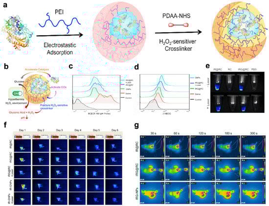 In Zhang’s research, smart macrophages loaded with GOx nanoparticles expressed by IR820 macrophages were successfully constructed for synergistic photothermal activation hunger therapy in tumors (Figure 6) []. Because macrophages have excellent phagocytosis abilities, H2O2-sensitive GOx nanozymes were loaded onto the macrophages to load drugs effectively. Second, macrophages carrying therapeutic agents naturally accumulate at the tumor site due to their inherent tumor tropism. This process creates the fluorescence imaging ability obtained by the photosensitizer IR820 to track the transportation process. Finally, the external laser and special TME trigger the spatiotemporal unpacking of the loaded therapeutic agent at the tumor site. Under fluorescence guidance, the GOx enzyme activity is no longer shielded, and starvation treatment begins. At this time, positive feedback is initiated in the tumor microenvironment, and the newly generated H2O2 further induces the activation of GNPs. In addition, laser-triggered PTT induces apoptosis of tumor cells for local tumor hyperthermia, accelerates the decomposition of H2O2 into O2, and enhances GOx enzyme activity for hunger therapy. Therefore, IRG@RC plays a variety of roles, such as those that promote laser-induced drug release and activation, the response of the tumor microenvironment, and circular amplification characteristics, realizing synergistic PTT and hunger therapy in vitro and in vivo.