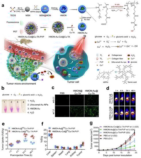 Nanozymes that have become PET probes include iron oxide nanoparticles, manganese oxide nanoparticles, Au nanoparticles, and graphene oxide nanoparticles [,]. Gold nanoparticles (Au NPs) are glucose OXD-like nanozymes that can efficiently catalyze glucose into H2O2 and gluconic acid. However, suppose that a large amount of surfactant is added during the preparation process to stabilize the ultrasmall AuNPs. In this case, the ultrasmall AuNPs cannot be used directly for biomedical applications. Additionally, these small Au NPs are rapidly cleared from systemic circulation by the kidneys. Therefore, an ideal nanocarrier is needed to immobilize ultrasmall Au NPs to ensure their biological safety and catalytic effect in vivo. Li et al. reported the in situ design of polymeric hollow mesoporous organosilicon nanoparticles (HMONs) to immobilize ultrasmall Au NPs and provide CDT with self-supplied H2O2 (Figure 7) []. Additionally, a Cu2+ tannic acid complex was deposited on the surface of the HMONs to initiate a Fenton-like reaction and convert the self-provided H2O2 into •OH, a highly toxic ROS. Last, collagenase (Col), which can degrade collagen I fibers in the extracellular matrix (ECM), was loaded into the biocatalytic nanoreactor to increase the permeability of the HMONs and O2 to enhance PDT. To determine the targeting effects of the nanomaterial HMON-Au-Col@Cu-TA-PVP in vivo, researchers performed PET imaging and NIR-II imaging. The results showed that the nanoprobe was clustered at the tumor site and reached its peak value in 24 h. The determined biological distribution in vivo lays a foundation for the clinical transformation of this nanomaterial. After CDT, approximately 80% of the pancreatic cancer xenograft tumor model animals experienced rapid tumor regression and long-term tumor-free survival.