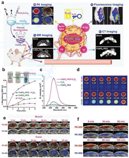 - Gong, F.; Yang, N.; Wang, Y.; Zhuo, M.; Zhao, Q.; Wang, S.; Li, Y.; Liu, Z.; Chen, Q.; Cheng, L. Oxygen-Deficient Bimetallic Oxide FeWO X Nanosheets as Peroxidase-Like Nanozyme for Sensing Cancer via Photoacoustic Imaging. Small 2020, 16, 2003496. [Google Scholar] [CrossRef] [PubMed]