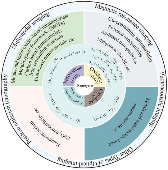 In general, nanozymes can be roughly divided into peroxidase (POD), oxidase (OXD), catalase (CAT), and superoxide dismutase (SOD) based on the substrates they catalyze [,,]. Although various nanomaterials with different properties and physiological functions have been exploited, most of those that are being used for cancer diagnosis and theranostics may be classified as oxidoreductase nanozymes [,].
