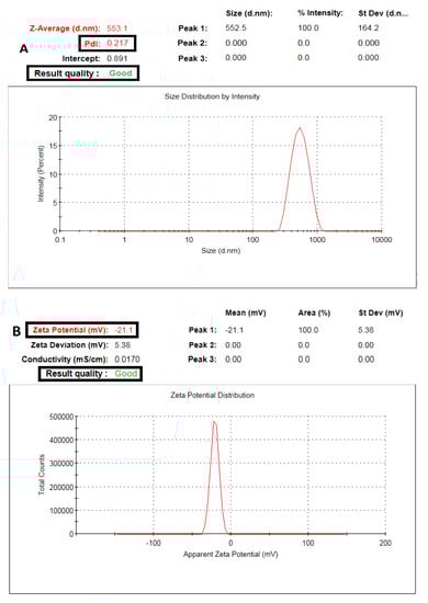 Malvern’s Zetasizer graphs of (A) Particle size and PDI, (B) ζ-potential values of CXB−GLR−PVP MPs exhibiting good quality results (Blacken outlined squares).