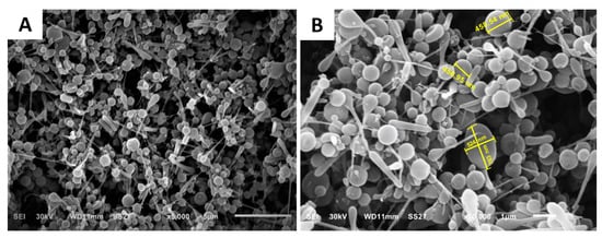 Scanning electron micrographs of CXB−GLR−PVP MPs were observed under (A) low magnification (×5000, scale bar 5 µm) and (B) high magnification (×10,000, scale bar 1µm).