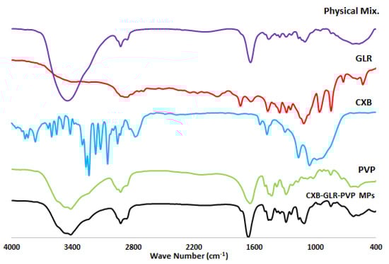 FTIR spectrum of CXB, Gelurice® 48/16, PVP K30, physical mixture, and CXB-GLR-PVP MPs at a range of 400–4000 cm−1.