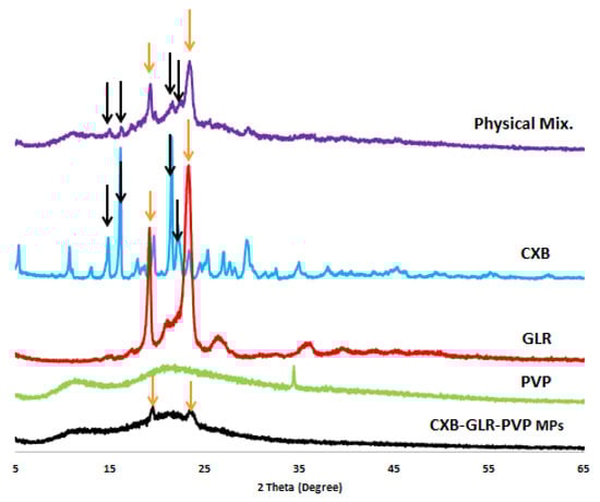 X-ray diffractogram of CXB, GLR, PVP, physical mixture, and CXB-GLR-PVP MPs showing the disappearance of sharp peaks of the CXB pattern. Orange arrows discriminate the characteristic peaks of GLR displayed on the pattern of pure Gelurice® 48/16, physical mixture, and CXB-GLR-PVP MPs at the same position. Black arrows show the main peaks of CXB on the pattern of pure CXB and the physical mixture.