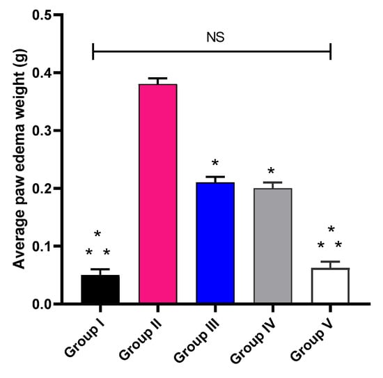 Average weight of paw edema. (*) designates a substantial difference (p < 0.05) in regard to group II. (**) designate a substantial variation (p < 0.05) in relation to groups III and IV. The NS acronym denotes a non-significant variation (p > 0.05).