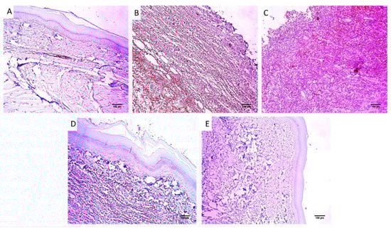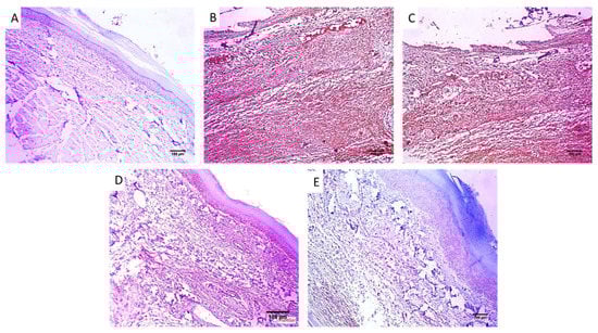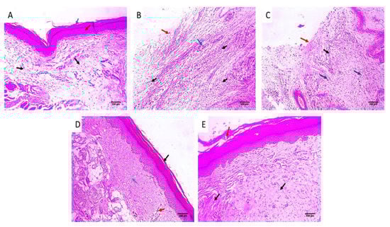 Paw skin sections stained with H&E of (A) Group I revealed normal skin. The epidermis has a normal thickness (red arrow) lined with keratin (blue arrow) and normal dermis (black arrows) below it (×100). (B) Group II and (C) Group III revealed surface ulceration (red arrow) with granulation tissue (blue arrow) with infiltration by inflammatory cells (black arrows) (×100). (D) Group IV revealed mild dermal inflammation (red arrow), and the epidermis had a higher thickness and mild keratosis (black arrow) with moderate collagenosis (blue arrow) (×100). (E) Group V revealed no inflammation, and the epidermis was thickened and covered with excessive keratosis (red arrow) with marked collagenosis (black arrow) (×100).