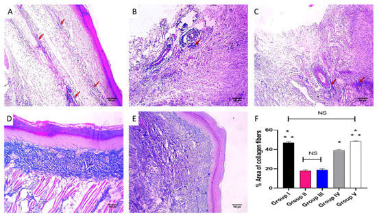 Paw skin sections stained with Masson’s trichrome stain of (A) Group I revealing bundles of collagen fibers (red arrows) (×100). (B) Group II and (C) Group III revealed focal collagen bundles (red arrows) (×100). (D) Group IV revealed a modest rise in the thickness of collagen (×100). (E) Group V revealed a noticeable rise in the thickness of collagen (×100). (F). The bar5 chart showed collagen fiber percentage. (*) designates a substantial variation (p < 0.05) in relation to group II. (**) designate a substantial variation (p < 0.05) with regard to groups III and IV. (NS) designates a non-significant variation (p > 0.05).
