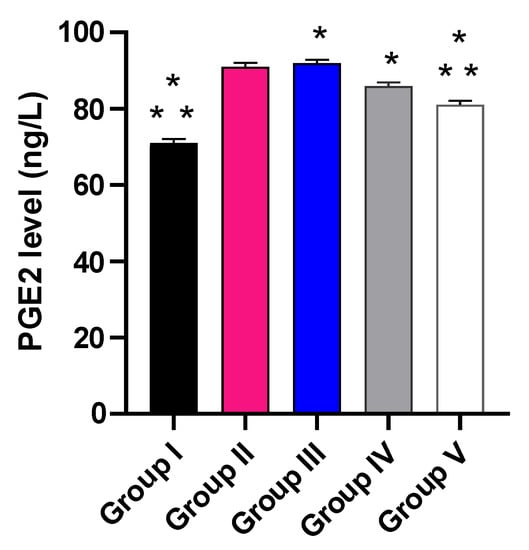 Group V revealed a considerable decline in PGE2 (11.11%) in relation to group II. Besides, it caused a marked decline in the level of PGE2 in relation to groups III and IV (13.04% and 5.88%, respectively).
