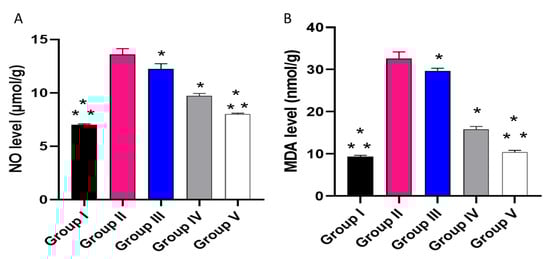 A graph displaying (A) NO and (B) MDA in the different studied groups. (*) designates a substantial variation (p < 0.05) in relation to group II. (**) designate a substantial variation (p < 0.05) in relation to groups III and IV.