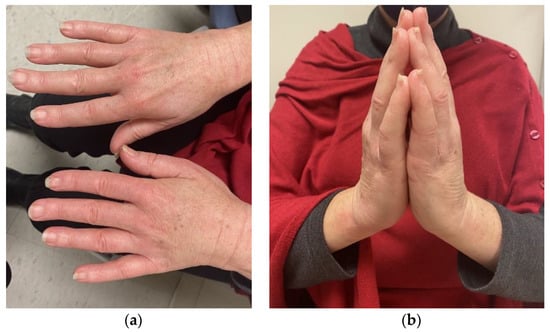 Physical exam findings associated with systemic sclerosis. Pertinent findings associated with systemic sclerosis include notable skin tightening with sclerodactyly (a) and consequent limitations in “prayer sign” (b) that is demonstrated here by a patient who received diagnosis of systemic sclerosis after start of checkpoint inhibitor therapy.
