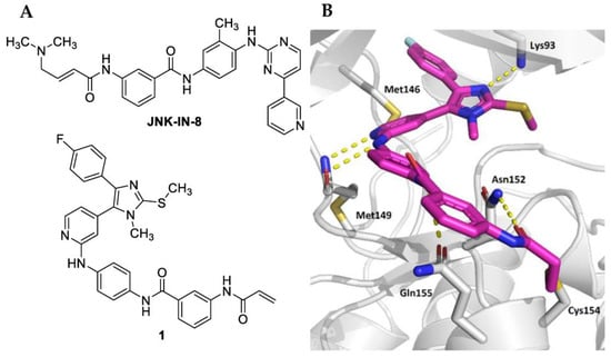 Figure 1. (A) Structures of covalent pan-JNK inhibitors JNK-IN-8 and 1. (B) Crystal structure of compound 1 in complex with JNK3 (PDB code—7ORF). Polar contacts are indicated by yellow dashed lines.