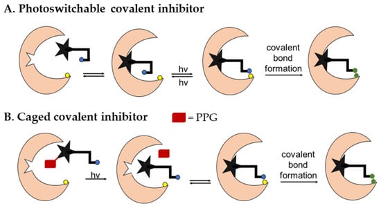 In contrast, photocaging is a concept where a bioactive compound is rendered unable to bind to its target by the attachment of a photocleavable protecting group (PPG) at a suitable position in the molecule [11,14,15]. If the photocleavable group is removed by irradiation, the binding affinity can be restored and, in the case of covalent inhibitors, the formation of the covalent bond to the target can take place (Figure 2B). This process is irreversible.