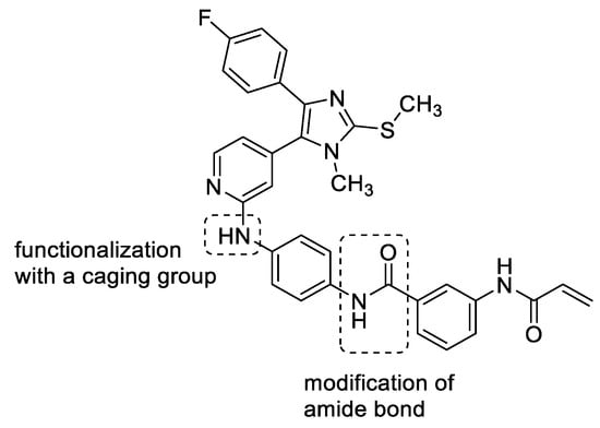 The aim of the present study was to design novel pyridinylimidazole-based covalent JNK3 inhibitors using compound 1 as the lead structure. First, the influence of the amide bond between the two benzene rings was investigated (Figure 4). Second, a photocleavable protecting group was introduced into the most promising modified covalent JNK3 inhibitor as a proof-of-concept study of photocaging this class of covalent JNK3 inhibitors. The hinge binding motif (pyridin-2-amino function) of 1 represents an essential structural feature for this inhibitor and its congeners to address the JNK3 ATP binding site (Figure 4). Consequently, we hypothesized this motif to be a suitable photocaging position, as the introduction of a bulky photocleavable protecting group is likely to impair the binding of the inhibitor to the hinge region of the targeted kinase, resulting in a weak or inactive compound.