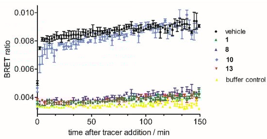 To study the putative covalent binding of inhibitors 8 and 13, we next applied the compound washout method in the NanoBRETTM assay [21]. Briefly, we established a protocol where the compound dissociation of 8 and 13 was determined indirectly by their ability to inhibit binding of the ATP-competitive tracer. The covalent inhibitor 1 was used as a positive control, and the propionamide 10 was used as a negative control. In this experiment, the saturated compound 10 was quickly displaced by the tracer, whereas inhibitors 8, 13, and lead compound 1 remained persistently bound to the target enzyme (Figure 5).