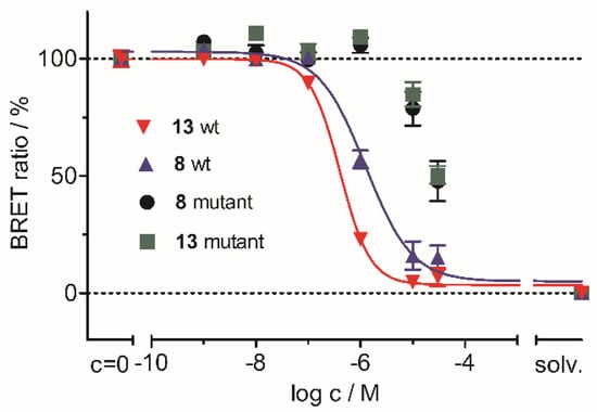 Figure 6. Determination of the IC50 values of 8 and 13 for wildtype JNK3-NLuc and for JNK3(C154A)-NLuc in a NanoBRETTM TE intracellular JNK3 assay.