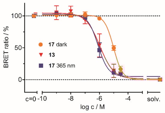Finally, this assay was repeated with compound 17, applying UV irradiation to achieve quantitative cleavage of the PPG. The selected conditions (light with a wavelength of 365 nm for 8 min) afforded full recovery of the binding affinity, as 17 and its unprotected parent compound 13 exhibited extremely similar IC50 values in this experiment (Figure 7). These results confirmed the successful application of the photocaging strategy to our covalent JNK3 inhibitor 13.
