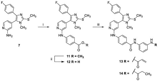 Pyridinylimidazole 13 and its saturated counterpart 14 were synthesized in three steps starting from compound 7 (Scheme 2). First, 7 was reacted with methyl 4-bromobenzoate under Buchwald-Hartwig conditions to yield compound 11. Then, the ester function present in 11 was converted into the free carboxylic acid 12 under basic conditions [25]. Finally, the carboxylic acid 12 was coupled with commercially available N-(3-aminophenyl)acrylamide or N-(3-aminophenyl)propionamide, respectively, using O-(7-azabenzotriazol-1-yl)-N,N,N′,N′-tetramethyluronium-hexafluorphosphate (HATU) as a coupling reagent to yield the covalent inhibitor 13 and its saturated counterpart 14, respectively.