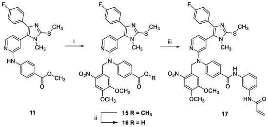 The synthesis of the photocaged compound 17 started from intermediate 11 (Scheme 3). First, the PPG was installed under nucleophilic substitution conditions using sodium hydride as base and 4,5-dimethoxy-2-nitrobenzyl bromide as alkylating reagent according to a modified literature protocol [26]. In the next step, the ester function of 15 was saponified, providing carboxylic acid 16. Finally, the electrophilic warhead was introduced by amide coupling of 16 with N-(3-aminophenyl)acrylamide to obtain pyridinylimidazole 17.