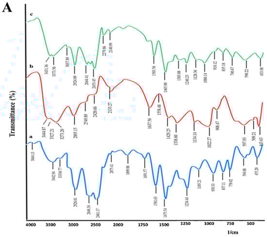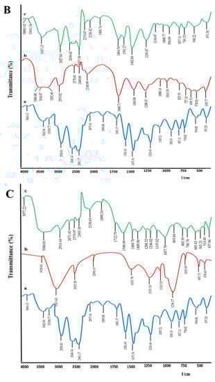 (A). FTIR overlay display of (a) clomipramine, (b) croscarmellose sodium, and (c) their mixture; (B). FTIR overlay display of (a) clomipramine, (b) crospovidone, and (c) their mixture; and (C). FTIR overlay display of (a) clomipramine, (b) Plantago ovata mucilage, and (c) their mixture.
