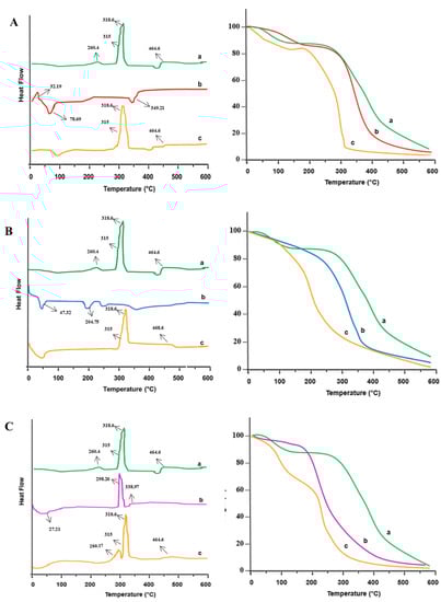 (A). DSC/TGA analysis of (a) clomipramine, (b) croscarmellose sodium, and (c) their mixture; (B). DSC/TGA analysis of (a) clomipramine, (b) crospovidone, and (c) their mixture; and (C). DSC/TGA analysis of (a) clomipramine, (b) Plantago ovata mucilage, and (c) their mixture.