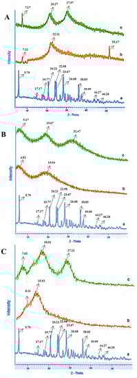 (A). PXRD analysis of (a) clomipramine, (b) croscarmellose sodium, and (c) their mixture; (B). PXRD analysis of (a) clomipramine, (b) crospovidone, and (c) their mixture; and (C). PXRD analysis of (a) clomipramine, (b) Plantago ovata mucilage, and (c) their mixture.