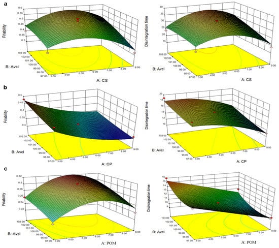 Three-dimensional response surface plots of friability (%) and disintegration time (s); (a) CS:Avcl; (b) CP:Avcl; and (c) POM:Avcl.