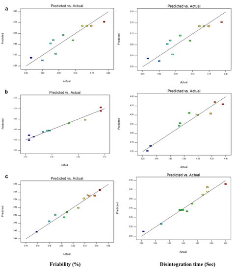 Plots of predicted vs. actual response of friability (%) and disintegration time (s); (a) CS:Avcl; (b) CP:Avcl; and (c) POM:Avcl.