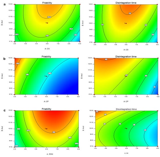 Two-dimensional contour plots of friability (%) and disintegration time (s); (a) CS:Avcl; (b) CP:Avcl; and (c) POM:Avcl.