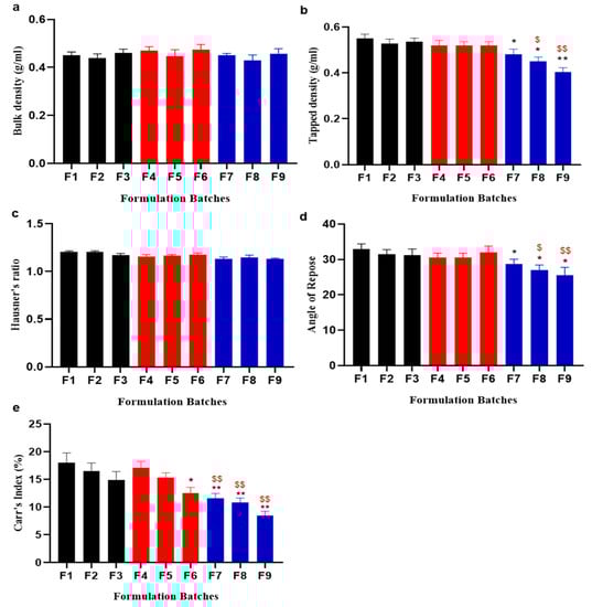 Comparison of pre-compression parameters: (a) Bulk density, (b) tapped density, (c) Hausner’s ratio, (d) angle of repose, and (e) Carr’s index of all prepared formulations with the two synthetic polymers, CS and CP, and one natural superdisintegrant, POM. F1–F3, represent the different ratios of CS:Avcl, F4–F6, represent the different ratios of CP:Avcl, and F7–F9, represent the different ratios of POM:Avcl. For all graphs, each column is expressed as the means ± SEM (*/$ p < 0.05; **/$$ p < 0.01; * is linked to statistically significant results on the comparison of F1–F3 to F4–F6 and F7–F9 at the same concentration of disintegrant and diluent used, and $ is linked to statistically significant results on the comparison of F4–F3 to F7–F9 at the same concentration of disintegrant and diluent used.