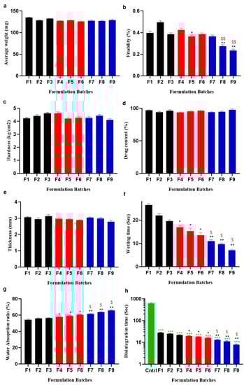 Comparison of post-compression parameters: (a) Average weight, (b) friability, (c) hardness, (d) drug content, (e) thickness, (f) wetting time, (g) water absorption ratio, and (h) disintegration time of all prepared formulations with the two synthetic polymers, CS and CP, and one natural superdisintegrant, POM. F1–F3, represent the different ratios of CS:Avcl, F4–F6, represent the different ratios of CP:Avcl, and F7–F9, represent the different ratios of POM:Avcl. For all graphs, each column is expressed as the means ± SEM (*/$ p < 0.05; **/$$ p < 0.01; *** p < 0.001),* is linked to statistically significant results on the comparison of F1–F3 to F4–F6 and F7–F9 at the same concentration of disintegrant and diluent used, and $ is linked to statistically significant results on the comparison of F4–F3 to F7–F9 at the same concentration of disintegrant and diluent used. All prepared ODTs were also compared with the commercially available non-ODT product clomfranil as a control.