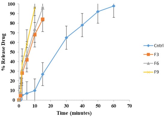 Drug release studies were performed at the in vitro level on commercially available non-ODT clomfranil (used as a control) and formulations F3, F6, and F9 to compare the effect of three different SDs used and to determine the difference between the ODT and non-ODT; the results are shown in Figure 9. The in vitro drug release study of formulations F3, F6, and F9 revealed that most of the drug was released in a very short time, i.e., 9–15 min, whereas the formulation containing 9% Plantago ovata mucilage (F9) presented the fastest release and the whole drug was released in 9 min. In general, all the formulations showed a dissolution rate in the given order: F3 > F6 > F9 > Cntrl; the ODT drug dissolution is proportional to the time it takes for them to disintegrate [,]. Overall, all of the prepared formulations significantly fulfilled the criteria of ODTs with a rapid dissolution rate as compared to the commercially available non-ODT product, clomfranil. The formulation F9 containing 9 mg of POM showed the fastest dissolution rate as compared to other formulations in which a synthetic superdisintegrant at an equal concentration level as that of POM was used. Therefore, batch F9 was perceived as an optimized formulation.