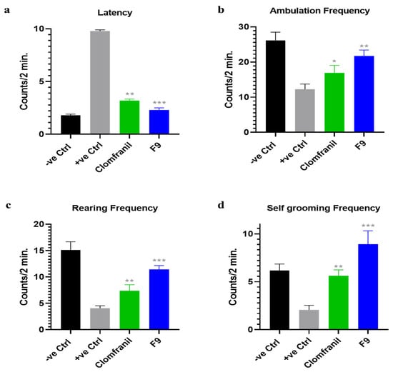 The anti-depressant effect of the optimized formulation (F9) and commercially available clomfranil tablet on the depressed behavior of rats by applying OFT. (a) Latency, (b) ambulation frequency, (c) rearing frequency, and (d) self-grooming frequency. For all graphs, each column is expressed as the means ± SEM (* p < 0.05; ** p < 0.01; *** p < 0.001).