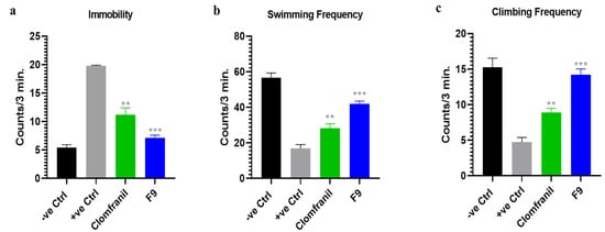 The anti-depressant effect of optimized formulation (F9), and the commercially available clomfranil tablet on the behavior of rats by applying the FST. (a) Immobility, (b) swimming frequency, and (c) climbing frequency. For all graphs, each column is expressed as the means ± SEM (** p < 0.01; *** p < 0.001).