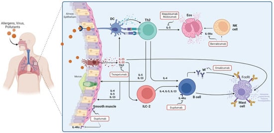 Asthma has been one of the main objectives in developing mAbs for immunoallergic respiratory diseases; however, the pathophysiology shared between this and other diseases have allowed its use in other conditions, with indications approved by consistent trials. Asthma is a chronic airway disease. It is characterized by variable expiratory airflow limitation and clinically represented by cough, wheezing, shortness of breath, and chest tightness. Asthma is a heterogeneous condition in both children and adults; scientific advances in recent decades have made it possible to understand this heterogeneity, describe disease pathogenesis, and develop new therapeutic strategies, especially in severe diseases [6]. An important molecular mechanism of asthma is type 2 inflammation, which occurs in many but not all patients. The cells involved in type 2 immune response of the airway are Th2 cells, IgE-producing B cells, ILC2s, mast cells, basophils, and eosinophils. This type of inflammation is characterized by the production of interleukin (IL)-4, IL-5, and IL-13, which are produced and released by cells of the adaptive and innate response, such as Th2 and ILC2s, respectively; ILC2 are activated by epithelial damage through the release of TSLP, IL-25, and IL-33 [10].