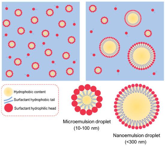 Macroemulsion is a thermodynamically unstable state; therefore, oil-water separation often occurs after storage. If co-solvents such as short-chain alcohols are added during high-speed homogenization, nanoemulsions with particle sizes ranging from 100 nm to 1000 nm can be obtained. When a large amount of surfactant is presented in the oil and water phases, microemulsions with particle sizes ranging from 10 to 100 nm can be formed spontaneously [31,32]. Microemulsions and nanoemulsions are all prepared by oil, water, and surfactant, having relatively similar structures (Figure 1). Owing to the small light scattering of microemulsions and nanoemulsions, the appearance of both is mostly transparent or translucent. However, these two types of emulsions have different composition ratios and formation mechanisms. Microemulsions are formed due to the saturated state of surfactant micelles after a large amount of oil is introduced into them. The free energy of colloidal dispersion is smaller than the separate phase. Therefore, when oil, surfactant, and co-surfactant are blended all together, the microemulsions occur rather spontaneously and involve almost no external energy, further indicating a favorable or stable thermodynamic state. In contrast, the nanoemulsions themselves are usually produced by applying shear stress to induce the formation of nano-sized droplets, resulting in an increase in the interfacial surface free energy. In this regard, nanoemulsions are regarded as thermodynamically unstable because they might further decompose into separate phases over time. However, this mechanism might also offer the nanodroplets to be kinetically stable, which is beneficial for long-term storage. The greater the energy barrier between the initial phase state and the emulsion state, the longer the nanoemulsions last before reverting to their original phase [33].