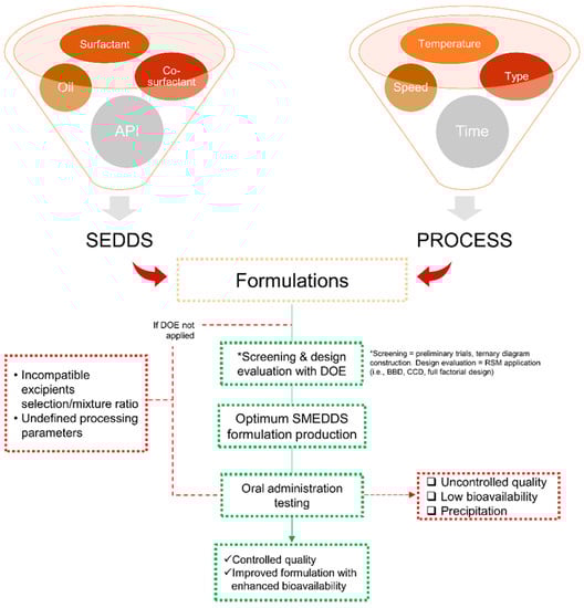 Numerous important parameters need to be involved during the development of SMEDDS formulations, while resources and time are nearly limited. Beyond all that, DoE is one of the effective tools to optimize SMEDDS composition. It offers an efficient experimental formulation that is more rational, ranging from the solubility of the active compound in the combination of excipients, construction of phase diagrams to obtain the most optimal formulation for SMEDDS, all characterizations, and the final responses [66,67,68]. Briefly, an overview of the DoE application in its role in SMEDDS development is presented in Figure 3, wherein it starts from the beginning of the experiments until the evaluation stages.