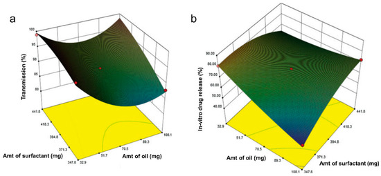 Response surface plot in three dimensions for BBD showing interaction effects between surfactant and oil on % transmission (a) and % cumulative drug release (b), from the study of zotepine in solid SMEDDS by Dalvadi and coworkers. Adapted from Dalvadi and coworkers [68].