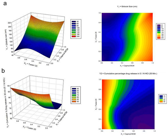 Response surface methodology (RSM) is a statistical approach used to generate empirical models that typically correlate responses with multiple input factors. It is possible to study the optimization process using the data gathered in this way from the experiments. The y response is a continuous function of several input variables , , ,… where the screening design is basically used sequentially to obtain the shape of the response surface [59]. Since the goal of RSM is to find the optimal response, some factors are utilized to obtain the process yield. For instance, in order to find the temperature () and pH which has an acceptable particle size of SMEDDS (y), the approximation can be denoted as follow: