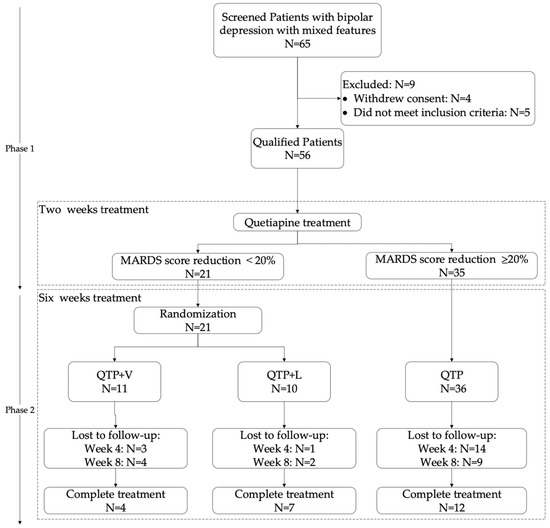 APA StyleWang, Z., Zhang, D., Du, Y., Wang, Y., Huang, T., Ng, C. H., Huang, H., Pan, Y., Lai, J., & Hu, S. (2023). Efficacy of Quetiapine Monotherapy and Combination Therapy for Patients with Bipolar Depression with Mixed Features: A Randomized Controlled Pilot Study. Pharmaceuticals, 16(2), 287. https://doi.org/10.3390/ph16020287