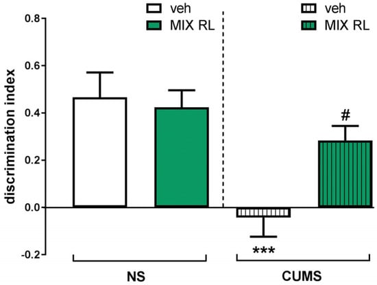 Effect of (R)-ketamine (1 mg/kg) co-administered with LY341495 (0.3 mg/kg) (mixRL) on the discrimination index in the temporal order memory task in the CUMS model of depression in mice. The values are expressed as the means ± SEM and were analyzed by two-way ANOVA. *** p < 0.001 CUMS main effect; # p < 0.05 CUMS × drug interaction (N = 10). mixRL—(R)-ketamine 1 mg/kg + LY 341495 0.3 mg/kg.