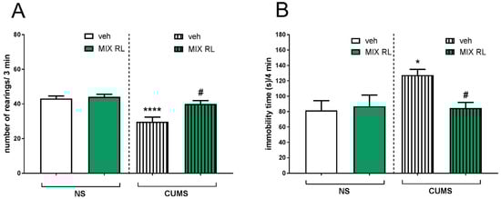 In the forced swim test (FST), a significant increase in the immobility time of the CUMS mice was observed compared to that of the unstressed controls. Two-way ANOVA showed the main CUMS effect (F(1,31) = 4.554, p < 0.05) and an interaction between two parameters, CUMS and mixRL (F(1,31) = 5.505, p < 0.05), confirming the ability of mixRL to reduce CUMS-induced effects in this test (Figure 2B).