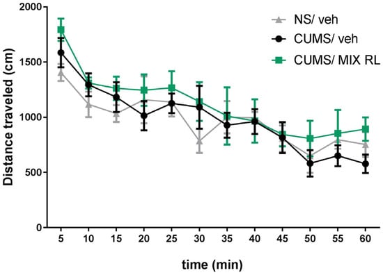 A two-way repeated-measures ANOVA showed a lack of effect of CUMS on the locomotor activity of mice (F(1,10) = 0.02492; p > 0.05) compared to that in NS mice. However, a main time effect was found (F(11,110) = 10.11; p < 0.0001). Furthermore, the analysis did not reveal an interaction between CUMS and NS (F(11,110) = 0.9478; p > 0.05) (Figure 3). A two-way repeated-measures ANOVA also showed that mixRL did not change the locomotor activity of the CUMS mice (F(1,10) = 1.115; p > 0.05). At the same time, the main effect of time was revealed (F(11,110) = 12.34; p < 0.0001), and there was no interaction between the parameters (CUMS and mixRL) (F(11,110) = 0.3883; p > 0.05) (Figure 3).