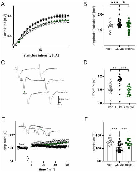 In slices prepared from stressed mice receiving mixRL, the maximal FP amplitude was comparable to slices obtained from the non-stressed vehicle group (p > 0.05, post hoc Tukey’s multiple comparisons test, Figure 4A,B; green circles vs. white circles), but it was significantly lower than in the CUMS group (p < 0.05, post hoc Tukey’s multiple comparisons test, Figure 4A,B; green circles vs. black circles). Parameters characterizing the input–output curves of FPs of all experimental groups, calculated using Boltzmann its, are summarized in Table 1.