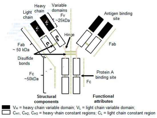 Monoclonal antibodies are basically glycoproteins of the Ig (immunoglobulin) superfamily, and its five isotypes are categorized as: IgA, IgD, IgE, IgG and IgM. Among these isotypes, the IgGs are frequently used for therapeutic applications. The IgGs are high molecular weight (~150 kDa) complex glycoproteins and comprise of two identical light and heavy chains of molecular weight of ~25 kDa and ~50 kDa, respectively, that are joined by disulfide bonds and non-covalent bonding at their pivotal point (Figure 1). In this way, the formed tetramer creates Y-like shapes with two identical halves. Constant and variable domains are formed by the intra-chain disulfide bonds in the polypeptide chains [7]. The antibody can be divided into two main regions: the Fab (antigen binding fragment) that recognizes the antigen; and the Fc (crystallizable fragment) that interacts with other elements of the immune system, such as phagocytes to promote removal of the antigen. The Fab consists of two variable and two constant domains. The variable domain known as variable fragment (Fv) provides specificity for the antigen whereas the constant domain acts as a structural framework. Each variable domain consists of three hypervariable loops, known as complementarity determining regions (CDRs), evenly distributed between four less variable framework (FR) regions.