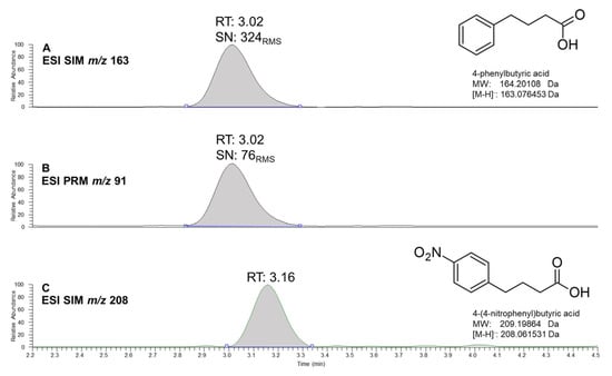 Chemical structures and chromatograms of 4-phenylbutyric acid (4-PBA) and 4-(4-nitrophenyl)butyric acid (NPBA, IS). (A,B) allow to compare the signal to noise ratio of 4-PBA in SIM and PRM acquisition modes, respectively. (C) shows IS (NPBA) chromatogram recorded in SIM.