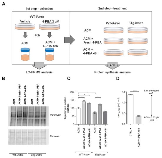 As published previously, 4-PBA treatment is able to rescue the defect of protein synthesis described in 3Tg-iAstro cells [2,26]. Here, we investigated if 4-PBA that remains in the media after 48 h of treatment of WT-iAstro (ACM + 4-PBA 48 h) is still able to induce the increase of protein synthesis in both WT and Tg-iAstro. With this aim, we designed an experiment consisting of two steps, as shown in Figure 2A. In the first step, WT-iAstro were plated and treated or not with 4-PBA (3 µM, 48 h). Astrocyte conditioned medium from iAstro that was not treated (ACM) was collected and stored. Part of these samples were used for the LC-HRMS assessment of 4-PBA concentration in the ACM, while another part was used in the second step of the experiment in which WT-iAstro and 3Tg-iAstro cells were treated with (i) ACM collected from WT-iAstro, treated with vehicle (ACM); (ii) ACM collected from WT-iAstro, treated with vehicle to which 3 µM of fresh 4-PBA was added (ACM + Fresh 4-PBA); (iii) ACM collected from WT-iAstro treated with 4-PBA (3 µM) for 48 h (ACM + 4-PBA 48 h). After 48 h, cells were pulse-labelled with puromycin and protein synthesis rate was assessed via WB (Figure 2B). ACM + 4-PBA 48 h, in which a concentration of 4-PBA 0.38 ± 0.02 µM was present in the medium, was still able to increase protein synthesis in WT-iAstro but had no effect on 3Tg-iAstro cells, suggesting that higher 4-PBA concentrations are necessary to rescue protein synthesis in 3Tg-iAstro (Figure 2C). It should also be noted that the 4-PBA concentration in the medium 48 h after treatment, which is about 10% of the initial 4-PBA concentration, was not negligible and was still able to induce a significant effect in WT-iAstro. These results emphasize the importance of monitoring the concentration of 4-PBA in culture media during treatment (Figure 2D).